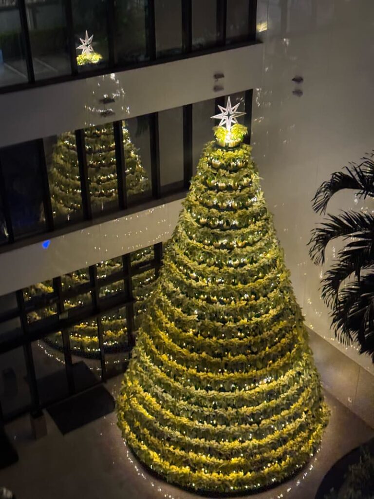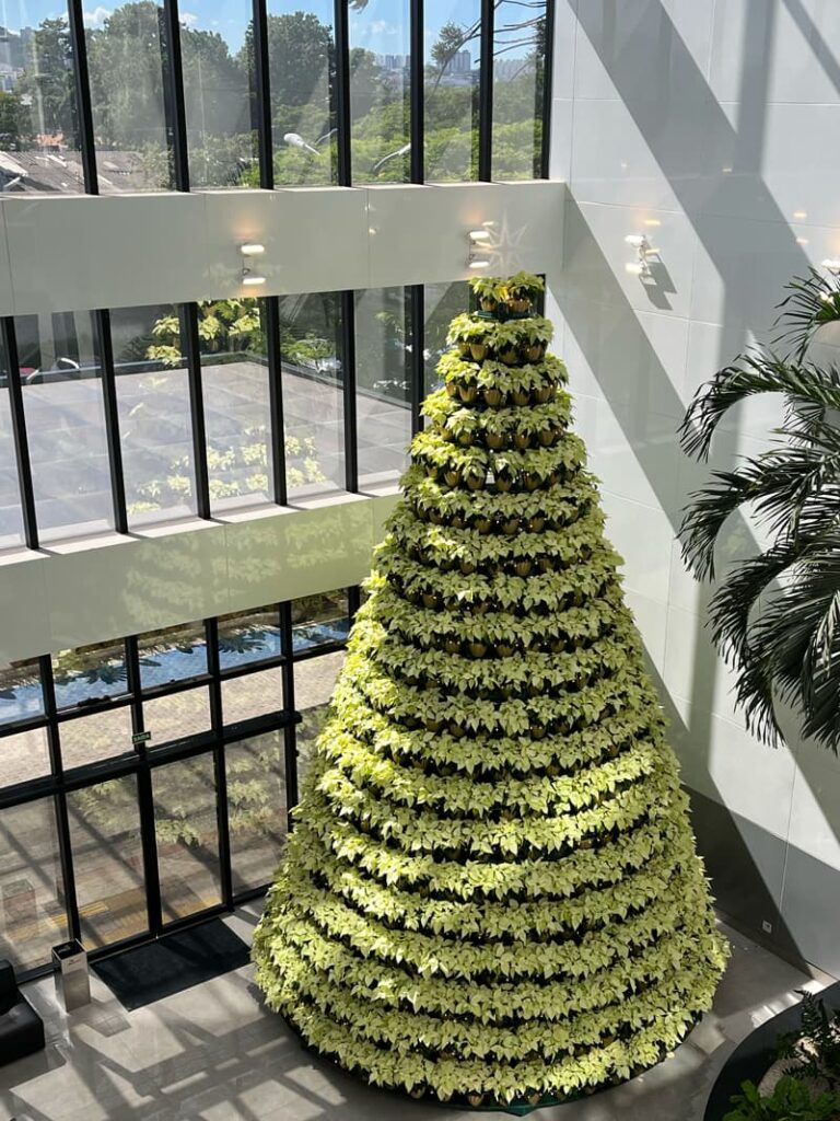 Este ano, para compor as três árvores, as plantas utilizadas são Poinsétias inteiramente brancas, preservando a simbologia tradicional do Natal, porém com um toque de elegância devido à sua cor neutra e às luzes pisca-pisca, que contribuem com um toque especial e minimalista.