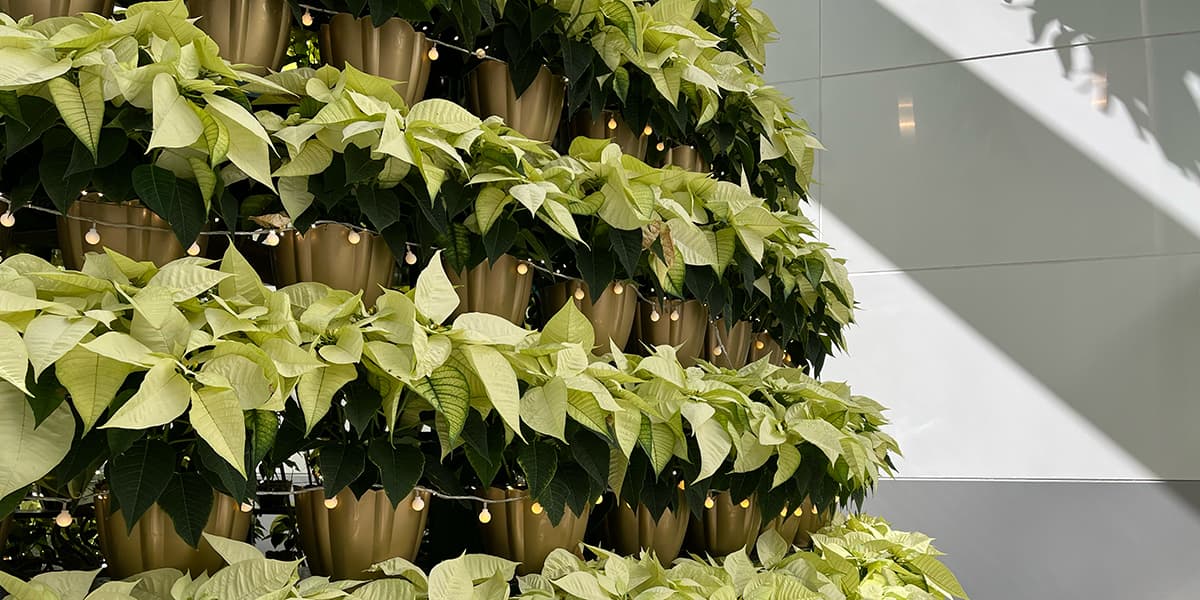 Este ano, para compor as três árvores, as plantas utilizadas são Poinsétias inteiramente brancas, preservando a simbologia tradicional do Natal, porém com um toque de elegância devido à sua cor neutra e às luzes pisca-pisca, que contribuem com um toque especial e minimalista.