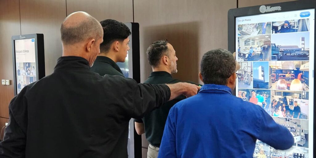 Em seguida, os colaboradores foram convidados a visitar o anfiteatro, onde uma exposição organizada em totens contou com centenas de fotos que marcaram a trajetória da Masipack e seus colaboradores, destacando momentos que contribuíram para seu sucesso.